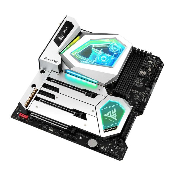 El diseño exclusivo de la Z490 Aqua incorpora un bloque de agua monolítico que cubre esencialmente toda la zona crucial del procesador y los VRM (módulos reguladores de voltaje), facilitando una disipación de calor superior para un overclocking estable y sostenido. Este sistema de enfriamiento no solo es práctico sino también estéticamente impresionante, complementando la apariencia general de cualquier configuración de alta gama. Además, con solo 999 unidades producidas, su exclusividad añade un valor considerable tanto para coleccionistas como para aquellos que buscan destacar en la construcción de sus sistemas.
